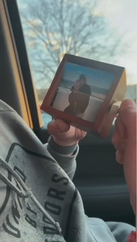 Rotate the wooden hand crank on the side of the Memora Flipbox to smoothly flip through your custom photo reel.